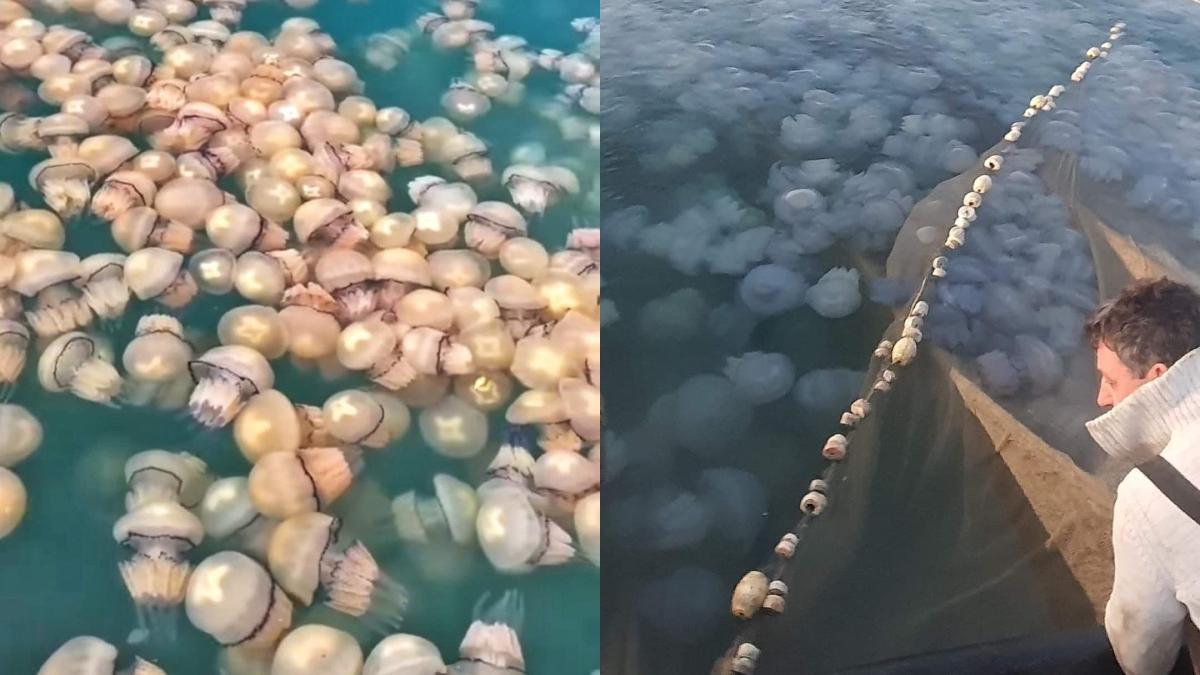Deja pe țărm au început să apară mai multe meduze, însă cele mai multe sunt în larg. Acestea le dau de furcă pescarilor, care au reușit să surprindă fenomenul în imagini specaculoase.