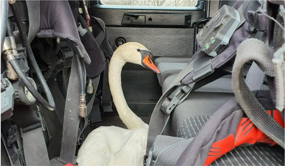 Cum au fost solicitaţi imediat să meargă la o intervenţie, au pornit cu tot cu lebăda din autospecială.