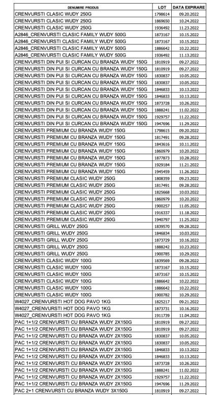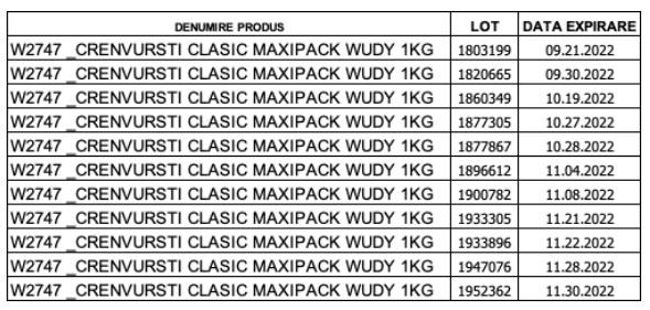 Potrivit ziuadeconstanta.ro, această decizie a fost luată ca urmare a detectării Listeria Monocytogenes, ca măsură de precauție retrăgându-se în mod voluntar toate loturile de crenvurști WUDY din toate punctele de vânzare din România pentru loturile și sortimentele mentionate mai jos.