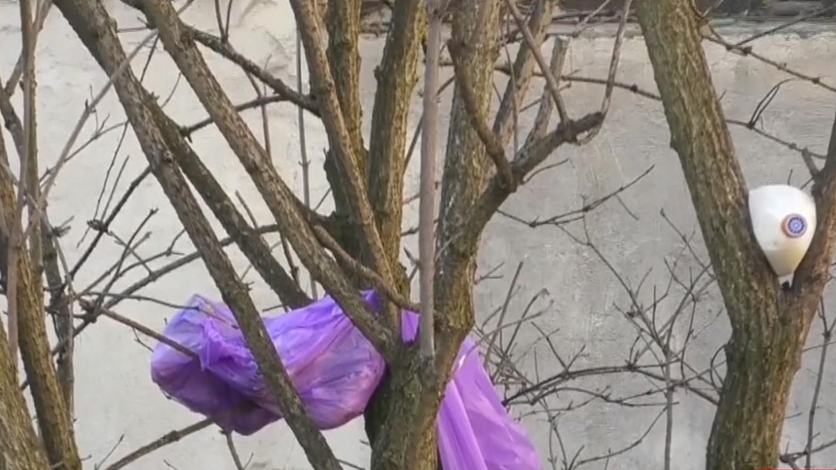 Sacii de gunoi menajeri ajung fie în copacii, fie în curtea unei pensiuni.