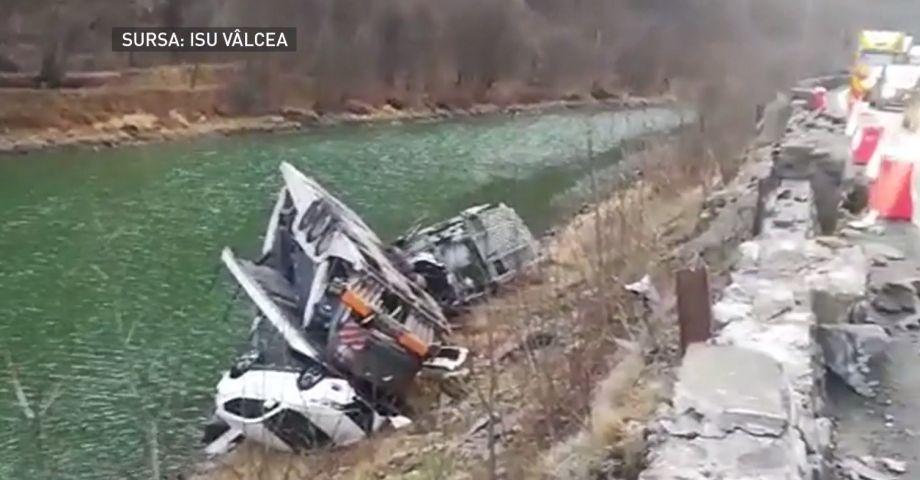 "La ora 00,18, pe DN7, la km 206+500m, la Brezoi, conducătorul unei autoutilitare de transport vehicule, un bărbat de 27 de ani, din Argeş, ce se deplasa pe sensul de mers Sibiu - Vâlcea, pe fondul oboselii, ar fi pierdut controlul asupra direcţiei de deplasare, a distrus parapetul din beton şi s-a răsturnat în râul Olt, în partea stânga a direcţiei sale de deplasare. Atât conducătorul autoutilitarei cât şi pasagerul au fost transportaţi la o unitate spitalicească în vederea acordării de îngrijiri medicale. Din cele 8 autoturisme care erau transportate de platformă au mai fost descoperite doar şase, două dintre acestea ajungând în râul Olt. De asemenea, din discuţiile purtate cu martorii oculari, înainte să părăsească partea carosabilă, autoutilitara ar fi acroşat un alt autoturism ce circula din sensul opus, care, la rândul lui, ar fi ajuns în râul Olt. La faţa locului, militarii ISU şi scafandrii efectuează activităţi de căutare. Până în momentul de faţă a fost descoperit şi scos doar un autoturism din cele căzute de pe platformă. Traficul nu este afectat", a precizat reprezentantul IPJ Vâlcea.