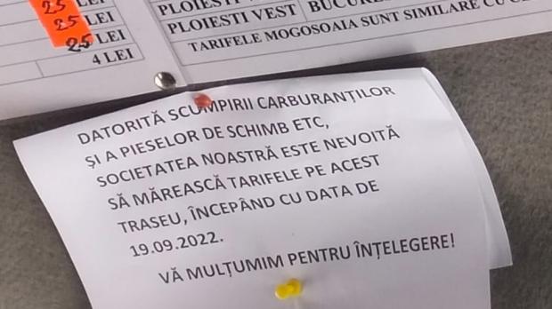 Şoferii societății de transport care efectuează curse pe ruta Ploiești Vest – Buftea-București le-au transmis oamenilor că scumpirea biletelor s-a făcut din cauza scumpirii carburanților și a pieselor de schimb, chiar dacă prețul acestora s-a stabilizat, iar Guvernul a anunțat în ședința de luni, 19 septembrie, prelungirea compensării de 50 de bani a prețului la pompă până la 31 decembrie, scriu jurnaliştii de la observatorulph.ro