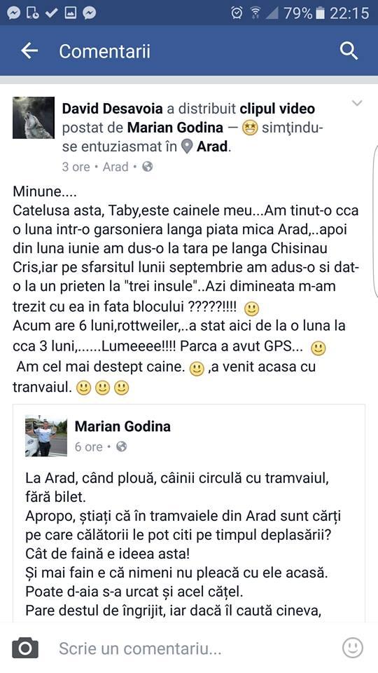 Marian Godină a publicat pe pagina sa de Facebook un material video realizat într-un tramvai din Arad. În imagini se poate vedea cum un cățel negru s-a urcat în mijlocul de transport și s-a plimbat de la un călător la altul, în căutare de afecțiune sau mâncare.