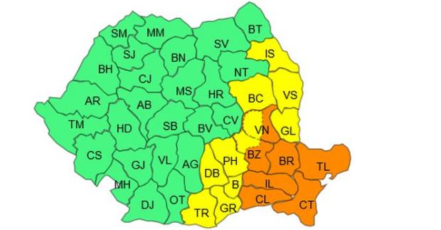 Codul portocaliu de viscol puternic este valabil în noaptea de marţi spre miercuri (10/11 ianuarie) şi în prima parte a zilei de miercuri (11 ianuarie), în judeţele Călăraşi, Ialomiţa, Brăila, Buzău şi Vrancea.