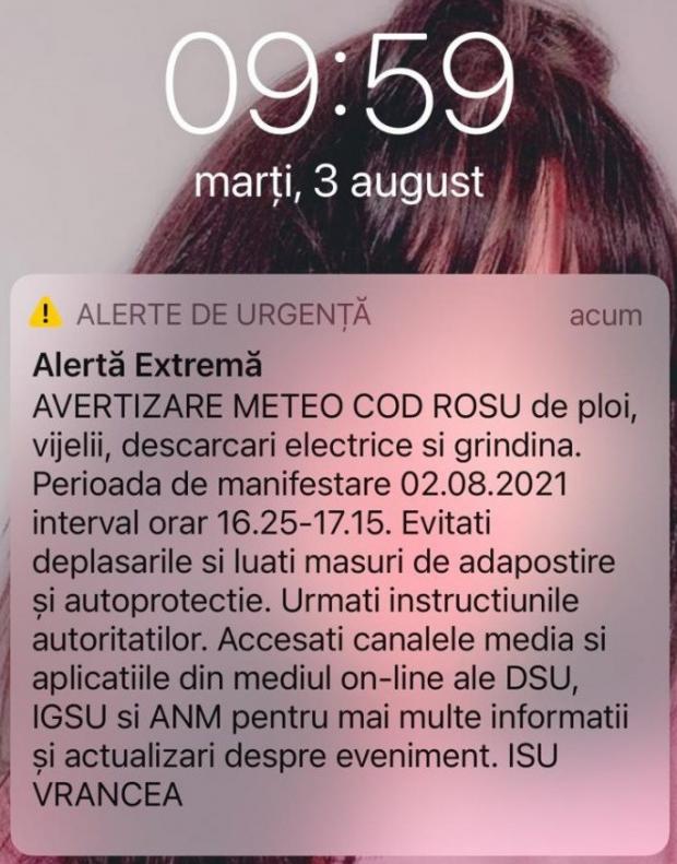 Prin mesajul RO-Alert, oamenii erau avertizaţi că luni, în intervalul orar 16.25 - 17.15, zona se află sub o avertizare meteo de cod roşu de ploi, vijelii, descărcări electrice şi grindină.
