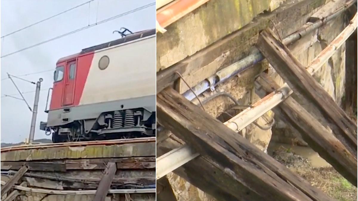 Podul feroviar din Târgu Ocna ar putea oricând să se prăbușească. Doar proptelele de lemn amână un deznodământ care ar putea avea urmări tragice.