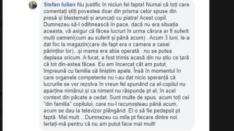 „Nu justific în niciun fel fapta! Numai că toţi care comentaţi ştiţi povestea doar din prisma celor spuse din presă şi blestemaţi şi aruncaţi cu piatra! Acest copil, Dumnezeu să-l odihnească în pace, dacă nu era situaţia aceasta, vă asigur că făcea lucruri în urma cărora ar fi suferit mulţi oameni (cum au suferit şi până acum). Acum 3 luni, le-a dat foc la magazin (care de fapt era o cameră a casei părinţilor lor)...şi mama era abia operată...nu se putea deplasa oricum. A furat, a fost trimis acasă din nu ştiu ce ţară că tot din-astea făcea. Eu am încercat cât am putut, împreună cu familia să liniştim apele. Însă în momentul în care organele competente nu i-au dat nicio speranţă că lucrurile se vor rezolva în vreun fel spunând ca el- copilul nu aparţine nimănui şi ca nimeni nu răspunde pt el; în acel context din păcate a cedat. Sunt multe de spus, acum toţi cei "din familia" copilului, care nu-l recunoşteau până acum, acum se dau la televizor plângând. El o să fie pedepsit pentru faptă. Mai mult....Dumnezeu cu mila pt fiecare dintre noi. Iertaţi-mă pentru că nu am putut face mai mult!”, a mai comentat preotul Ştefan Iulian.