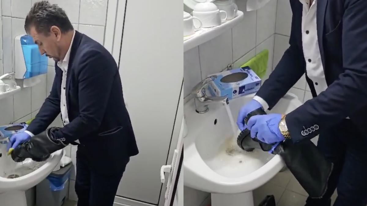 Deloc supărat, Iosif Bimbo a așezat cizmele sub bradul de la primărie, apoi s-a înarmat cu mănuși și s-a apucat de spălat, în timp ce era filmat.