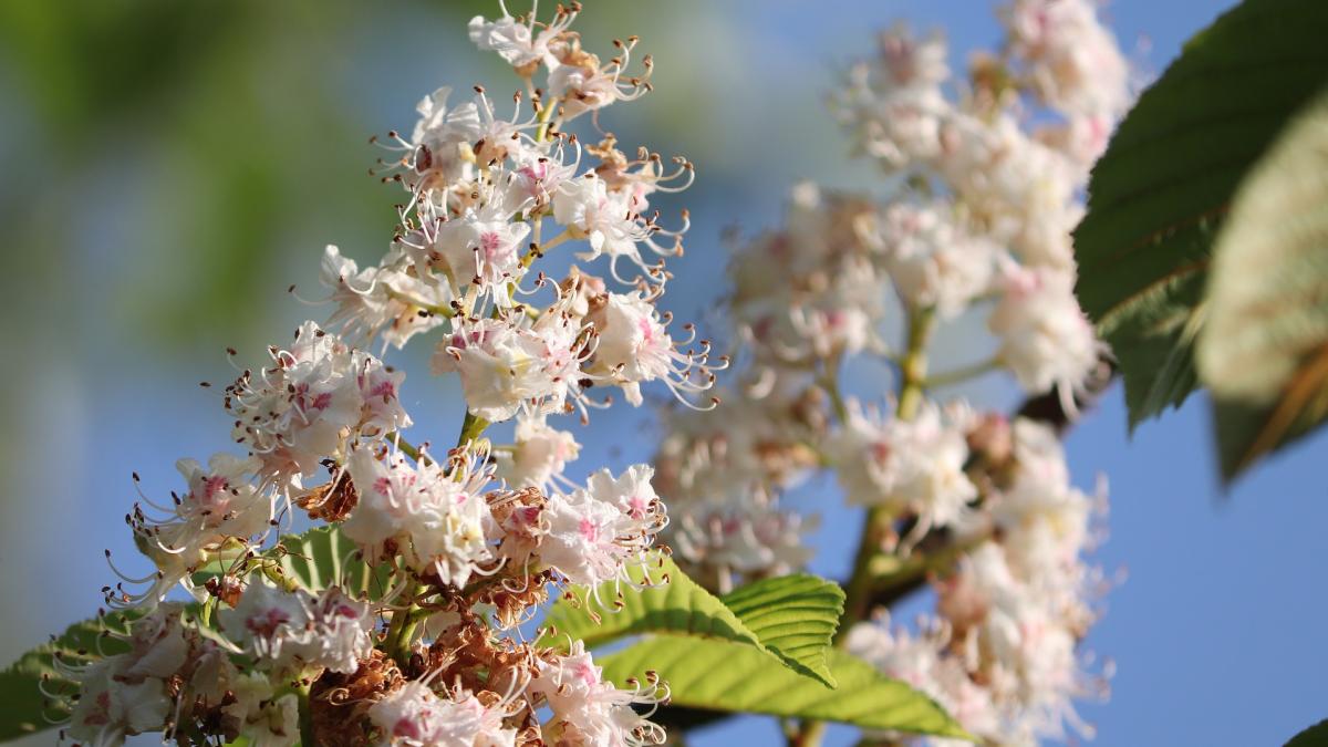 Zeci de castani din întreg orașul sunt încărcați cu flori, în special pe ramurile din vârf.