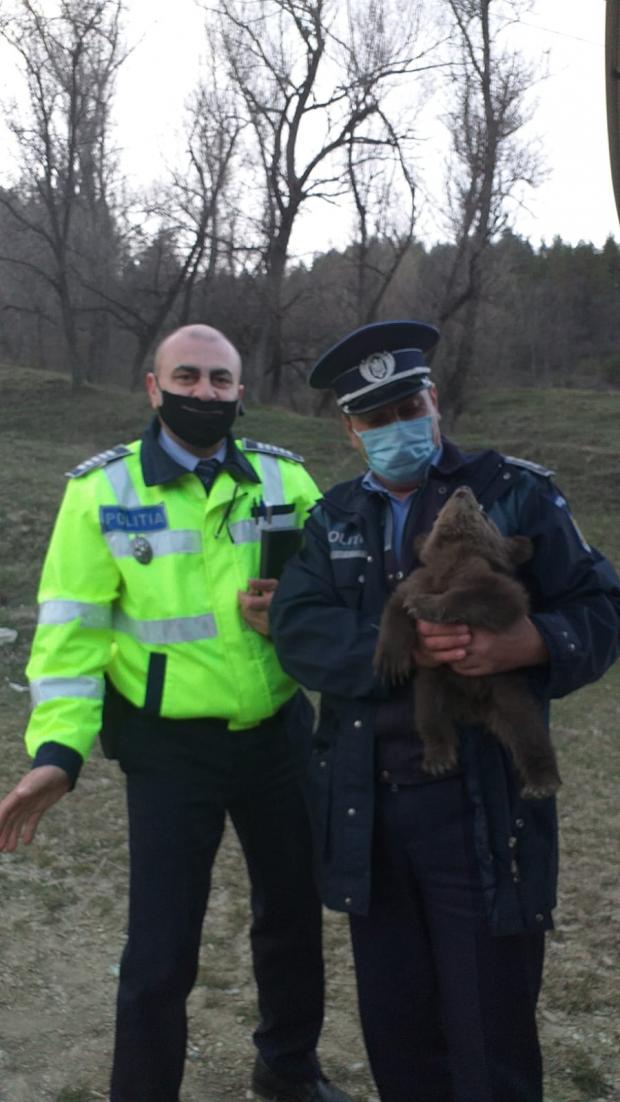 "Ce-i drept, nu i-a prea plăcut acolo și a început să zgârie spătarul. Ce să îi faci, este și el mic. Puiul de urs este bine și sperăm ca în curând să i se găsească și mama", susține Poliția.