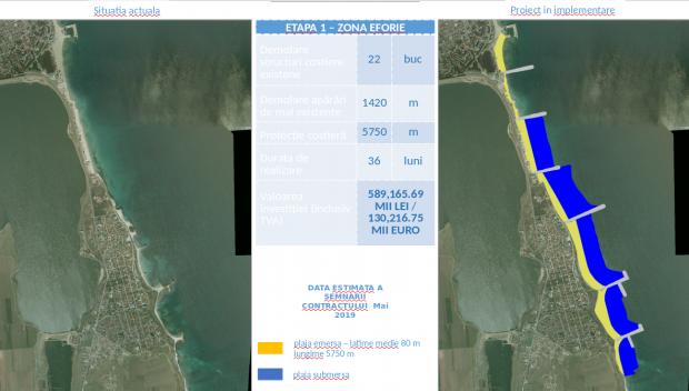 - zona Eforie - demolare structuri costiere existente, demolare apărări de mal existente, protecție costieră pe o lungime de 5.750 metri, plajă de o lungime de 5.750 de metri și o lățime medie de 80 de metri - 130 de milioane de euro.