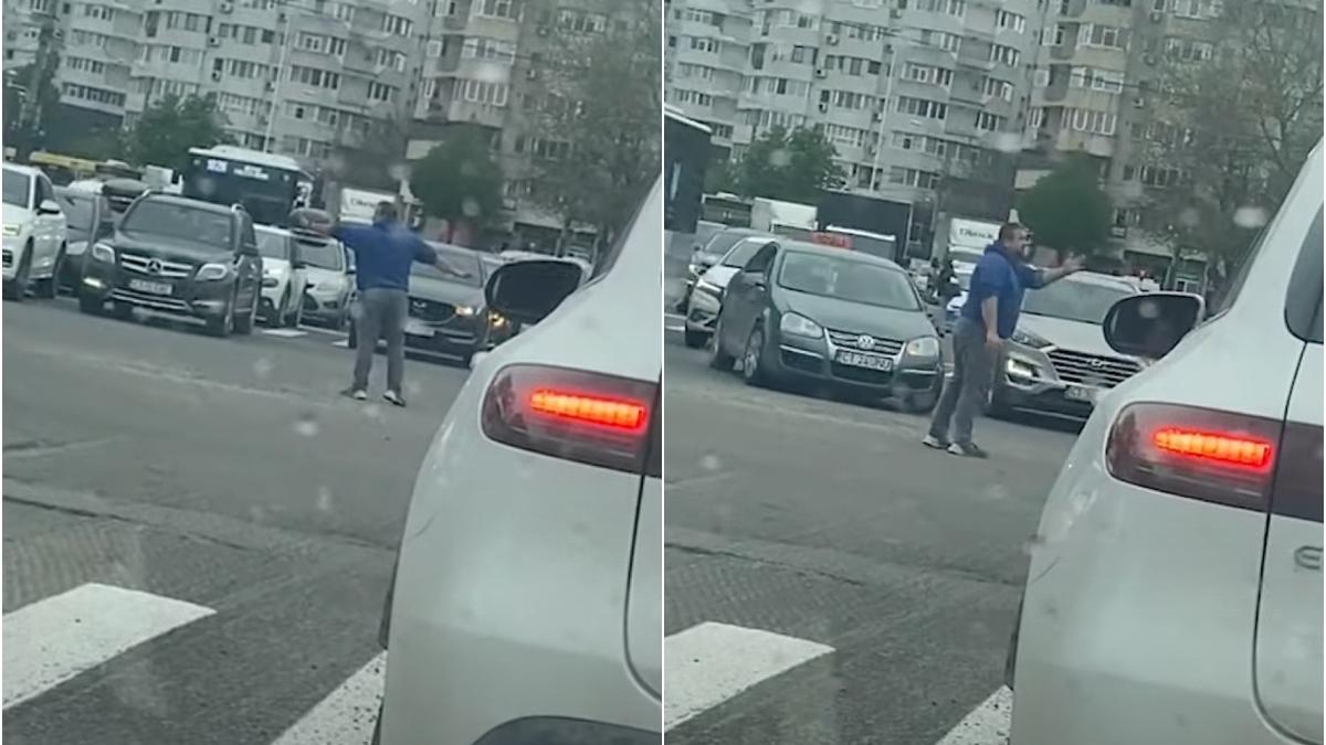 Scenele care au urmat au fost surprinse de un alt șofer care aștepta în coloană și au arătat bărbatul dirijând circulația cu maximă seriozitate.