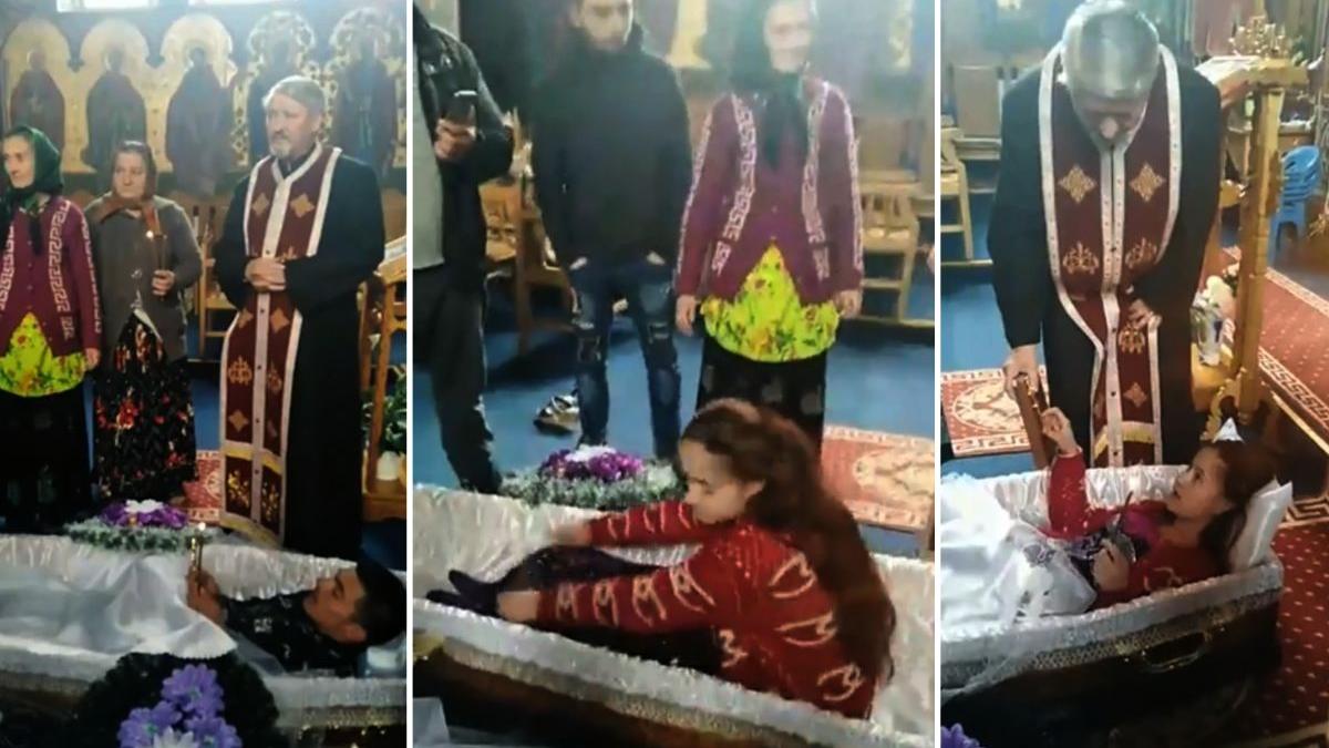 Pe imagini se poate observa cum mai mulţi tineri, pe rând, sunt băgaţi în sicriul aşezat în mijlocul bisericii, iar apoi sunt puşi să jure cu mâna pe Biblie că nu vor mai face faptele de care sunt acuzaţi sau că nu sunt vinovaţi de respectivele fapte.
