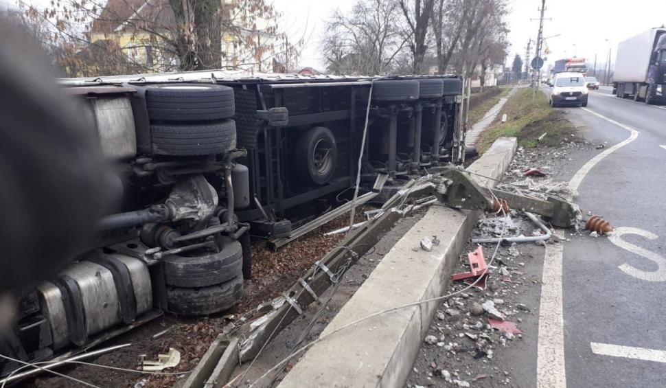 Autocamionul este răsturnat în afara părții carosabile, iar la locul accidentului au fost chemate mai multe autospeciale.