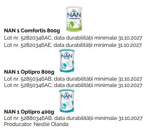 Magazinele Selgros, Auchan și Kaufland au anunțat că retragerea vizează mai multe loturi din produsele NAN 1 Comfortis 800g, NAN 1 Optipro 800g, NAN 1 Optipro 400g.