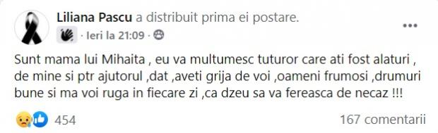 "Sunt mama lui Mihăiţă. Eu vă mulţumesc tuturor care aţi fost alături de imne şi pentru ajutorul dat. Aveţi grijă de voi, oameni frumoşi. Drumuri bune şi mă voi ruga în fiecare zi ca Dumnezeu să vă ferească de necaz!".