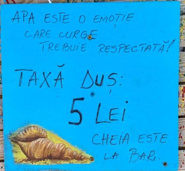 „Dacă ești pe plajă și trebuie să mergi la toaletă, trebuie să iei cheia de la bar pentru a deschide lacătul de la toaleta ecologică! Dacă vrei să faci un duș după plajă, trebuie să ai la tine 5 lei pentru a plăti taxa de acces la duș!