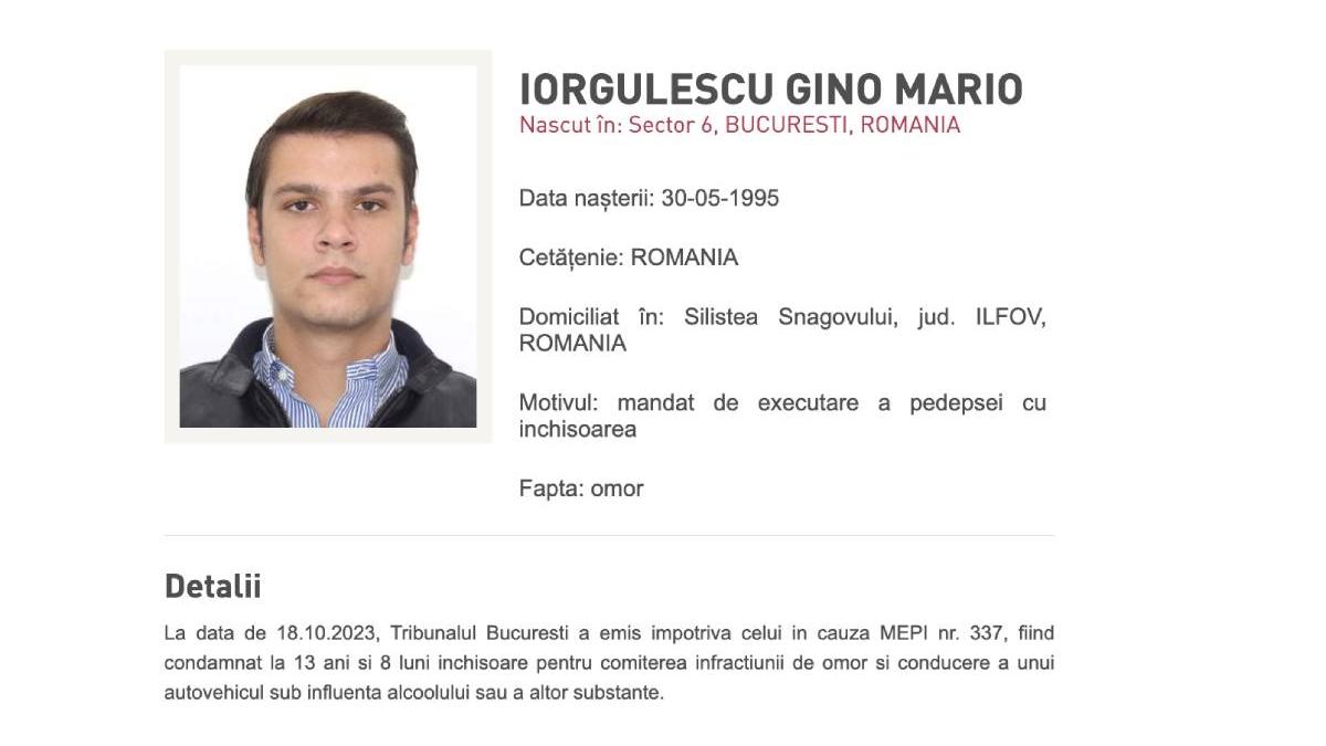 Poliţia Română l-a dat în urmărire generală pe Mario Iorgulescu, după ce acesta nu s-a prezentat pentru a-şi ispăşi pedeapsa dictată de instanţă.
