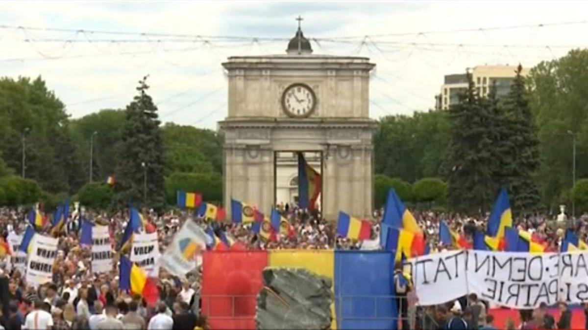 Mulţimea de manifestanţi s-a strâns în Piaţa Marii Adunări Naţionale din Chişinău. Manifestanţii, majoritatea tineri, au desfăşurat un uriaş drapel tricolor şi au afişat pancarte cu mesaje unioniste.