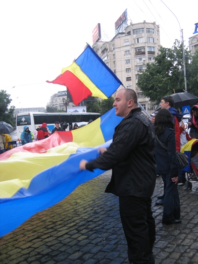 Marşul tinerilor din organizaţia Noua Dreaptă a ţinut până la orele 13.30, când, alungaţi de ploaia puternică din Capitală, ei s-au retras, împreună cu steagul imens al României, pe care l-au ţinut în continuare în mâini.