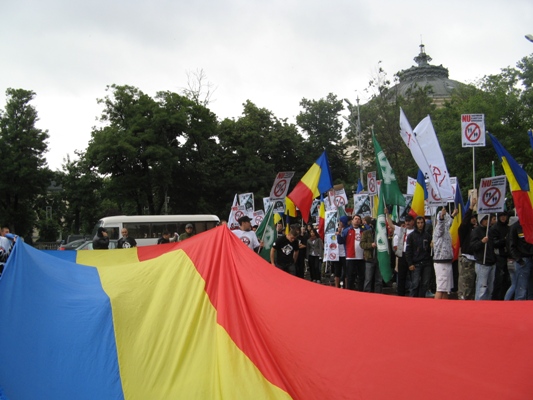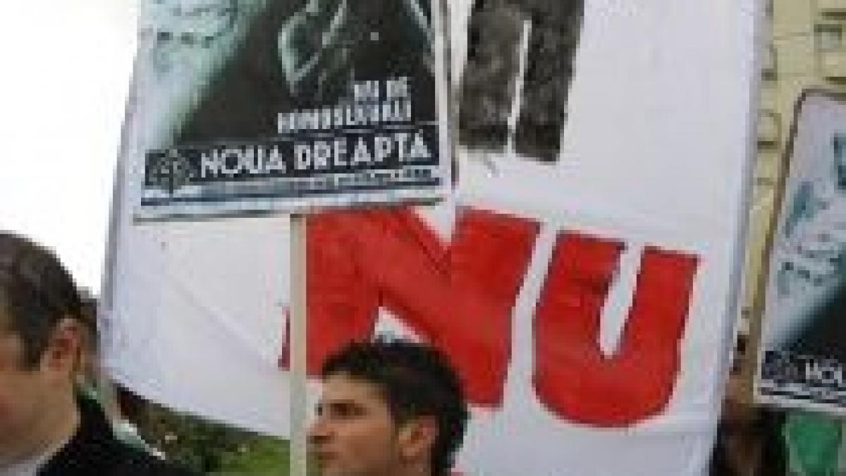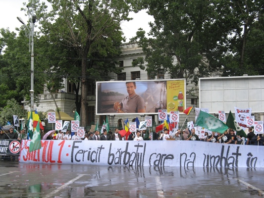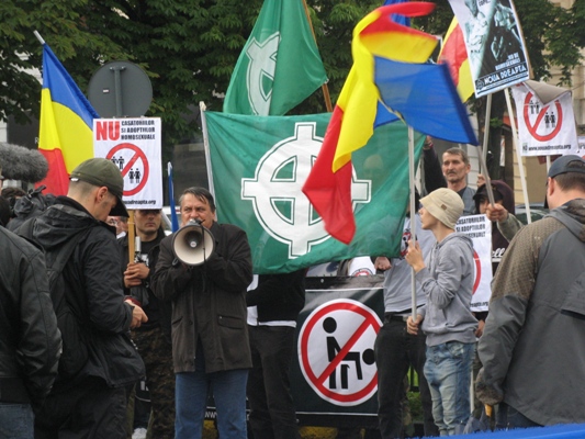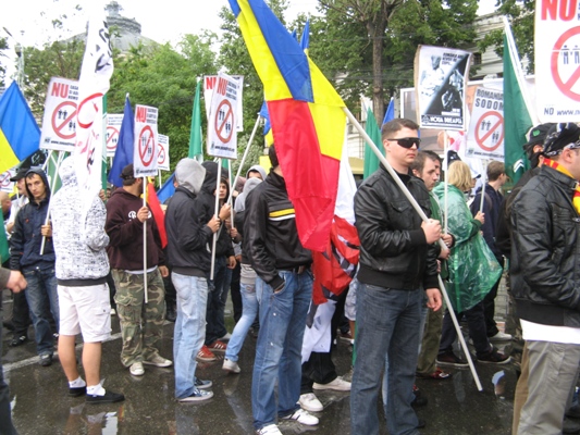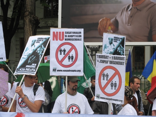 De asemenea, cei de la Noua Dreaptă şi-au actualizat scandările la situaţia economică din România şi au inscripţionat pe pancarte lozinci de genul ?Românii se zbat în sărăcie şi homosexualii se destrăbălează, ruşine?.