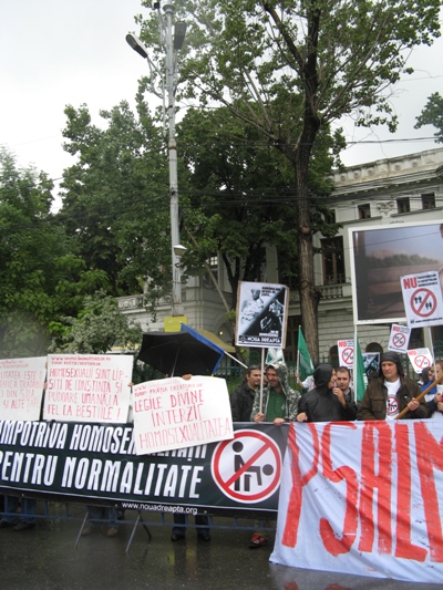 Tinerii care strigau îndârjit împotriva homosexualilor, lesbienelor sau a altor minorităţi sexuale au declanşat un război verbal când au ajuns în faţa Mitropoliei. Un membru al Noii Drepte a ţinut în ploaia care turna de zor un discurs contra comunităţii gay şi a precizat că homosexualitatea este o boală psihică, tratabilă în clinicile din SUA sau Austria.