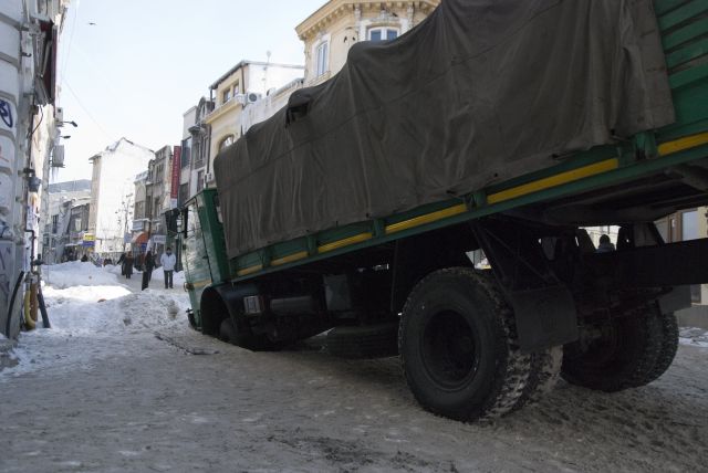 "O echipă de pompieri a fost chemată pe strada Lipscani, Bucureşti, pentru a ajuta la curăţarea unor ţurţuri de pe streaşina unei clădiri. Strada era acoperită cu zăpadă, inclusiv traversele din lemn ce s-au rupt imediat ce maşina a ajuns pe ele", notează utilizatorul Videonews.ro.