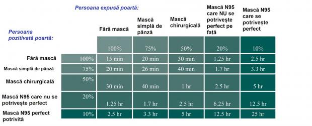 Un studiu al Universității din Minnesota a analizat eficienţa măştilor de protecţie. Dacă persoana infectată este fără mască și porţi o mască de pânză, după 20 de minute rişti să te infectezi, o mască chirurgicală te protejează jumătate de oră, iar una tip FFP2 îţi asigură protecţie 2 ore şi jumătate.