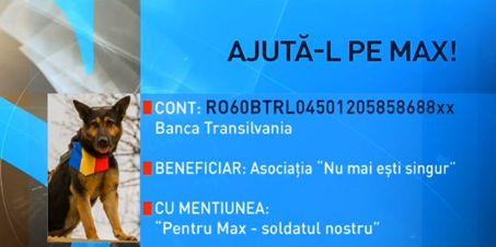 Max, câinele care detectează bombe şi care a efectuat timp de 3 ani misiuni în teatrele de operaţii din Afganistan a fost scos din serviciu de Armata Română. A ajuns în grija unei doamne inimoase care suportă din resurse proprii cheltuielile cu hrana şi mai ales cu tratamentul şi intervenţiile medicale de care Max are nevoie pentru a lupta cu dirofilaria.
