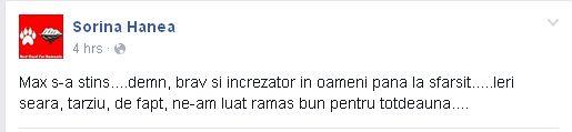 "Max s-a stins....demn, brav şi încrezător în oameni până la sfârşit.....Ieri seară, târziu, de fapt, ne-am luat rămas bun pentru totdeauna....", a scris Sorina Hanea, femeia care îl luase în grijă pe Max de anul trecut.