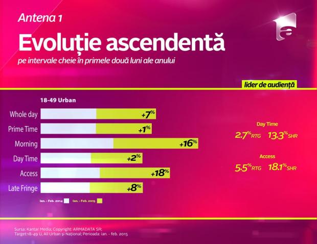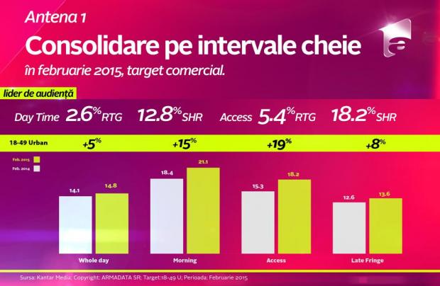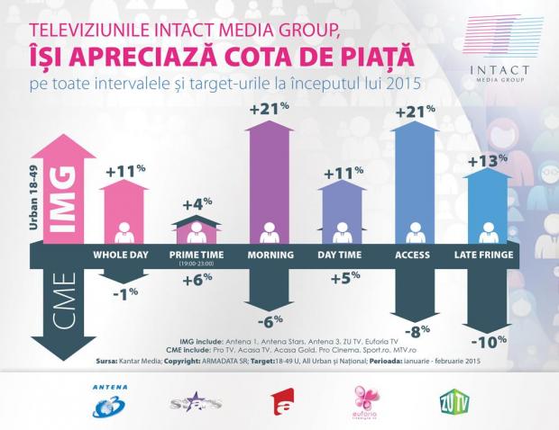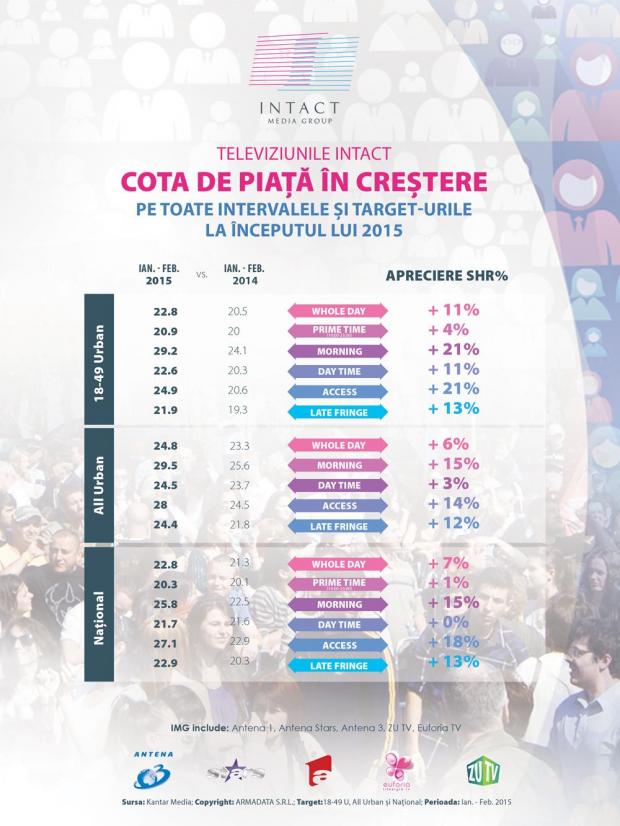 • Februarie 2015 aduce şi creşteri ale cotei de piaţă pe toate intervalele orare din targetul All Urban, comparativ cu aceeaşi luna a anului trecut. Televiziunile Intact sunt lider de audienţă în Whole Day, Morning, Day Time, Access şi Late Fringe. În ceea ce priveşte targetul Naţional, Antenele sunt lider în Whole Day, Day Time, Access şi Late Fringe.