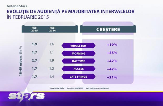 • Antena Stars îşi menţine evoluţia ascendentă, cu aprecieri importante pe majoritatea intervalelor orare şi în feburarie 2015, comparativ cu aceeaşi luna a anului trecut.