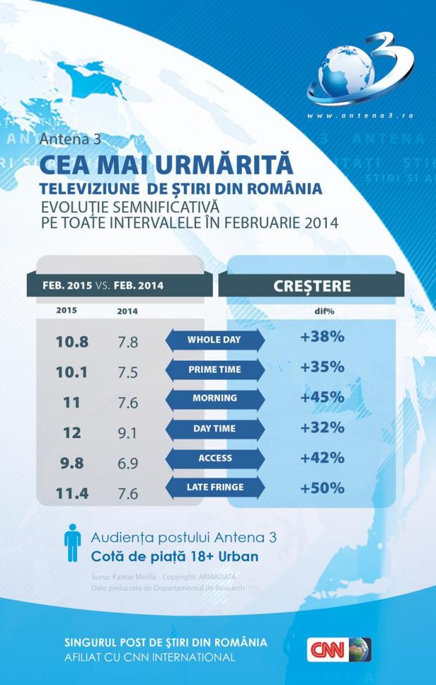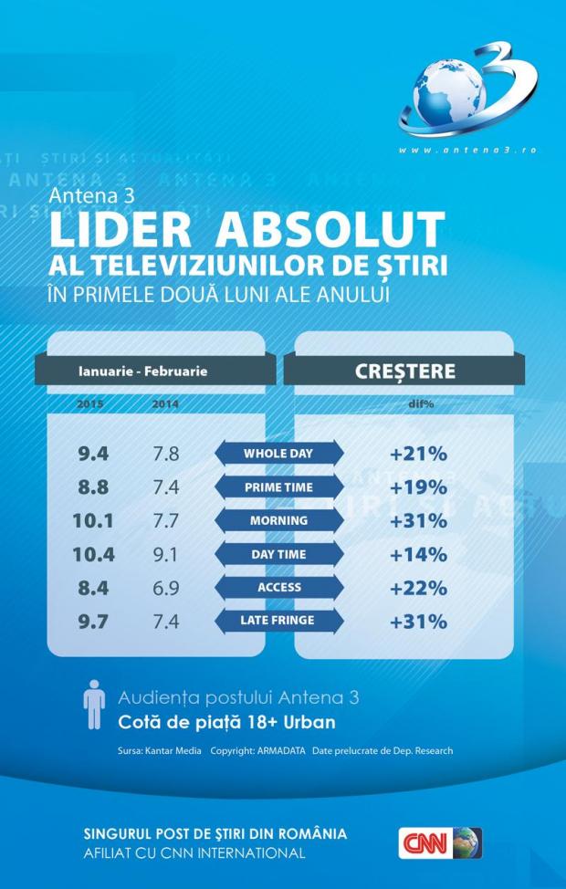 • Cota de piaţă a Antenei 3 are un trend ascendent şi în februarie 2015, creşteri importante de audienţă înregistrându-se pe fiecare interval orar. Cea mai mare apreciere, de 50%, se înregistrează în Late Fringe. Antena 3 este lider de audienţă la nivelul întregii pieţe în luna februarie 2015, target 18+ Urban.