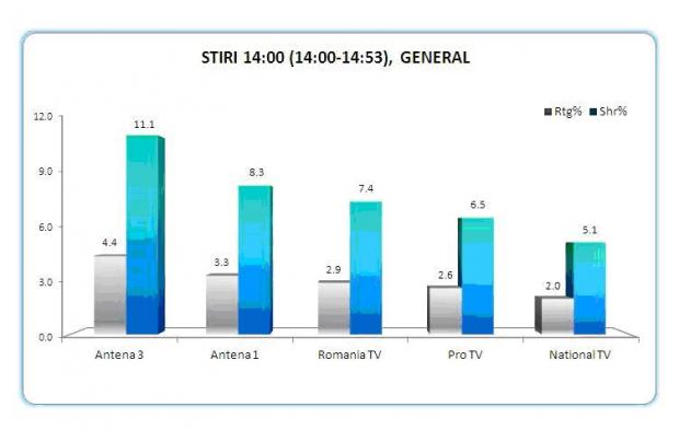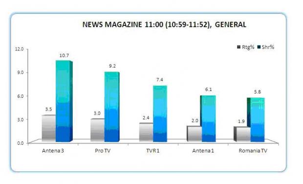 In prima parte a zilei, performerele au fost News Magazine cu Andreea Stroe, care a obtinut 3.5%rating si 10.7% cota de piata, si Stirile orei 14, prezentate de catre Lorena Burlacu, cu 4.4 puncte audienta si 11.1% market share.