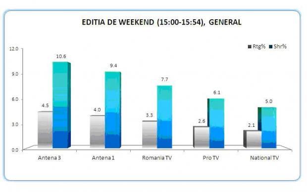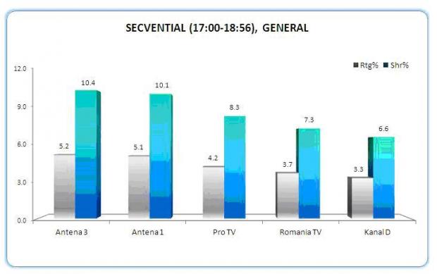 Dupa amiaza, cele mai urmarite programe tv din Romania au fost “Secvential cu Adrian Ursu”, care a inregisstrat, pe targetul 18+ urban, o medie de 5.2% rating si 10.4 % cota de piata, si “Editie de weekend”, realizata de catre Andreea Dumitrache, cu medii de 4.5% rating si 10.6% market share.