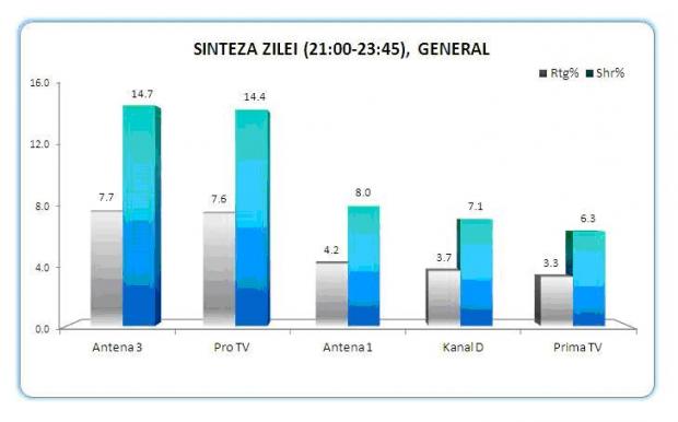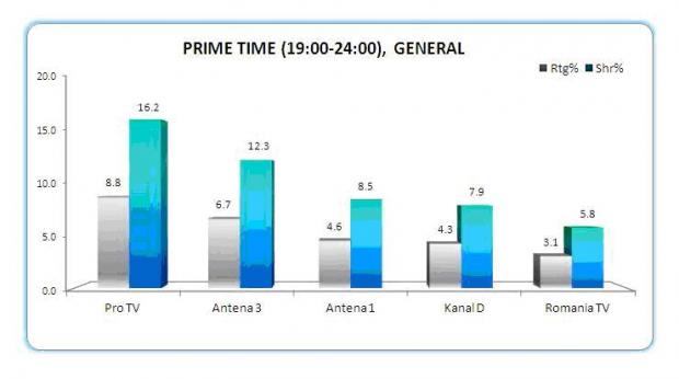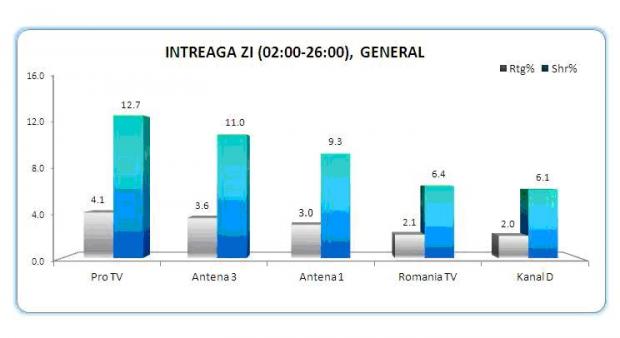 Pe intreaga zi, Antena 3 a inregistrat o medie de 11% cota de piata, iar in prime time 12.3 procente, conform Kantar Media, Antena 3 ocupand pozitia a doua in piata pe ambele sloturi orare, dupa Pro TV.