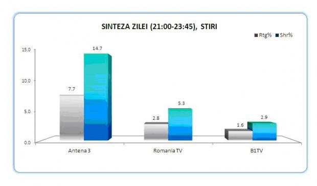 Seara, “Sinteza Zilei cu Mihai Gadea” a obtinut o audienta spectaculoasa, 7.7 puncte rating si 14.7% cota de piata, fiind cea mai urmarita productie tv din Romania timp de aproape 3 ore. In timpul emisiunii lui Mihai Gadea s-a atins si varful de audienta, la ora 21:55, cand aproape 1 milion de telespectatori urmareau Sinteza Zilei, iar Antena 3 inregistra 18% market share.