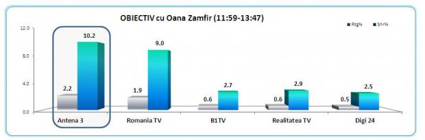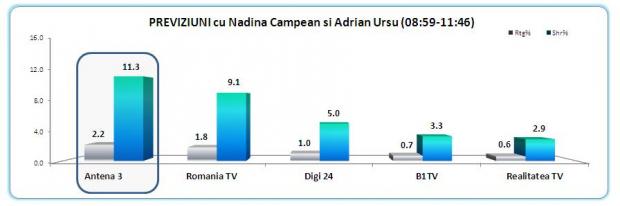 Emisiunea Previziuni cu Nadina Campean si Adrian Ursu alaturi de Obiectiv-ul Oanei Zamfir s-au impus, de asemenea, in fata productiilor concurente din intervalele aferente de difuzare, cu medii de 11.3%, respectiv 10.2% market share,