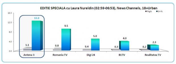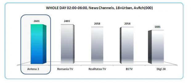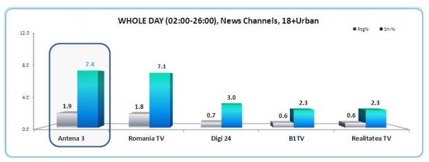 De altfel, Antena 3 a fost cel mai urmarit post informativ din Romania intreaga zi de 9 noiembrie, cu o medie de 7.4% cota de piata.