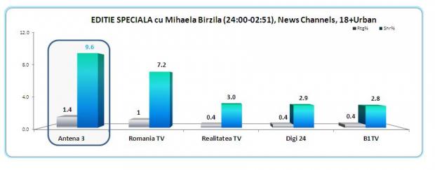 Editia speciala realizata de Mihaela Birzila, incepand cu ora 00:00, a obtinut o medie de 9.6% market share si a fost cel mai urmarit program al nisei de stiri in intervalul sau orar de difuzare.