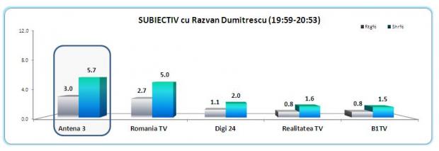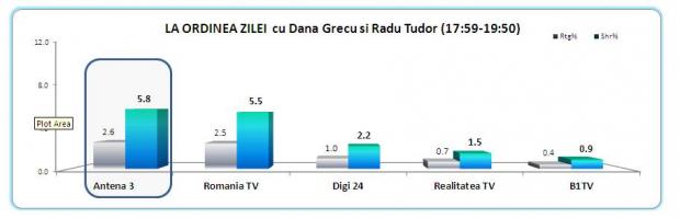 iar Dana Grecu si Razvan Dumitrescu au mentinut Antena 3 pe prima pozitie cu medii de 5.8% si 5.7% cota de piata.