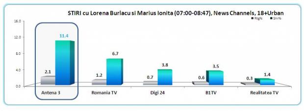 De la ora 7, Lorena Burlacu si Marius Ionita au dus stafeta mai departe cu o medie de 11.4% market share, pastrand Antena 3 pe cea mai inalta pozitie.