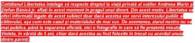 "Cotidianul Libertatea înţelege să respecte dreptul la viaţă privată al soţilor Andreea Marin şi Ştefan Bănică jr, aflaţi în acest moment în pragul unui divorţ. Din acest motiv, Libertatea va oferi informaţii legate de acest subiect doar dacă acestea vor servi interesului public al cititorului, aşa cum este cazul şi materialului de mai sus. De asemenea, ziarul nostru nu va mai publica, până la separarea oficială, nici o fotografie în care să fie prezentă micuţa Violeta, în vârstă de 5 ani, chiar dacă acestea au fost folosite în trecut cu acordul unuia dintre părinţi", se arată într-un articol publicat astăzi pe site-ul cotidianului.