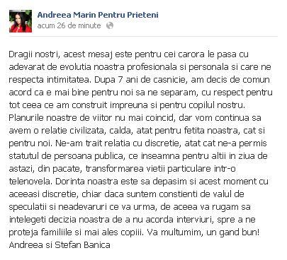 "După 7 ani de căsnicie, am decis de comun acord că e mai bine pentru noi să ne separăm, cu respect pentru tot ceea ce am construit împreună şi pentru copilul nostru. Planurile noastre de viitor nu mai coincid, dar vom continua să avem o relaţie civilizată, caldă, atât pentru fetiţa noastră, cât şi pentru noi. Ne-am trăit relaţia cu discreţie, atât cât ne-a permis statutul de persoană publică, ce înseamnă pentru alţii în ziua de astăzi, din păcate, transformarea vieţii particulare într-o telenovelă.