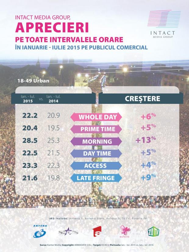 10.315.000 de români au urmărit emisiunile televiziunilor Intact, în primele șapte luni ale lui 2015, timp de cel puţin un minut, la nivel naţional, în Whole Day. În Prime-Time, numărul telespectatorilor este de 7.526.000 milioane telespectatori.