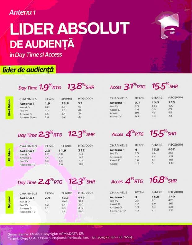 - Antenele sunt lider absolut de audiență în Day Time, Access și Late Fringe și dețin supremația în Whole Day atât în rândul publicului din întreg mediul urban, cât și la nivel național.