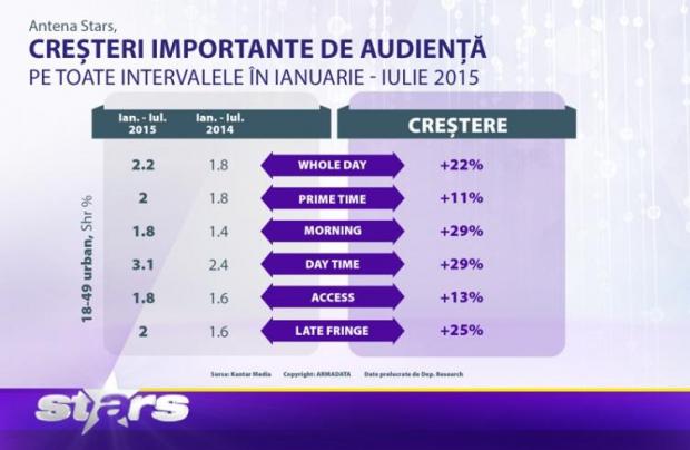 - Numărul de telespectatori care urmăresc postul de mondenități al trustului Intact este în continuă creștere: Antena Stars are aprecieri ale cotei de piață pe toate intervalele orare, în intervalul ianuarie-iulie 2015.