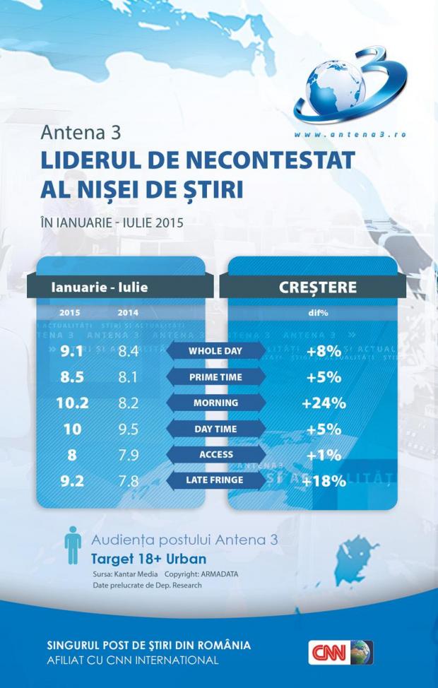 - Antena 3 conduce pe toate intervalele orare și are creșteri pe toate intervalele orare comparativ cu perioada ianuarie-iulie 2014.