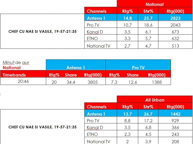 Primul show oferit de Antena 1 romanilor, in seara de Revelion, a fost “Chef cu Nae si Vasile”, lider de audienta atat pe publicul comercial, care cuprinde telespectatorii cu varste cuprinse intre 18 si 49 de ani, cat si in randul romanilor din intreg mediul urban, dar si din National. Vedetele care au interpretat muzica populara, dar si pop, precum si sketch-urile amfitrionilor show-ului, Nae si Vasile, au adus Antenei 1 un varf de audienta de peste 3.800.000 de telespectatori, inregistrat pe targetul National, la ora 20.46.
