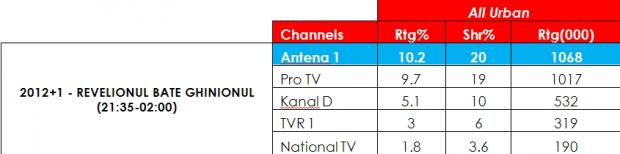 Ultima seara a lui 2012 a insemnat si o victorie in Prime-Time a Antenei 1 pe toate target-urile importante: 18 – 49 Urban, All Urban si National. In acest interval orar au fost trasmise Observatorul orei 19,00, Chef cu Nae si Vasile, precum si Show-ul care a spart ghinionul, al lui Dan Negru.
